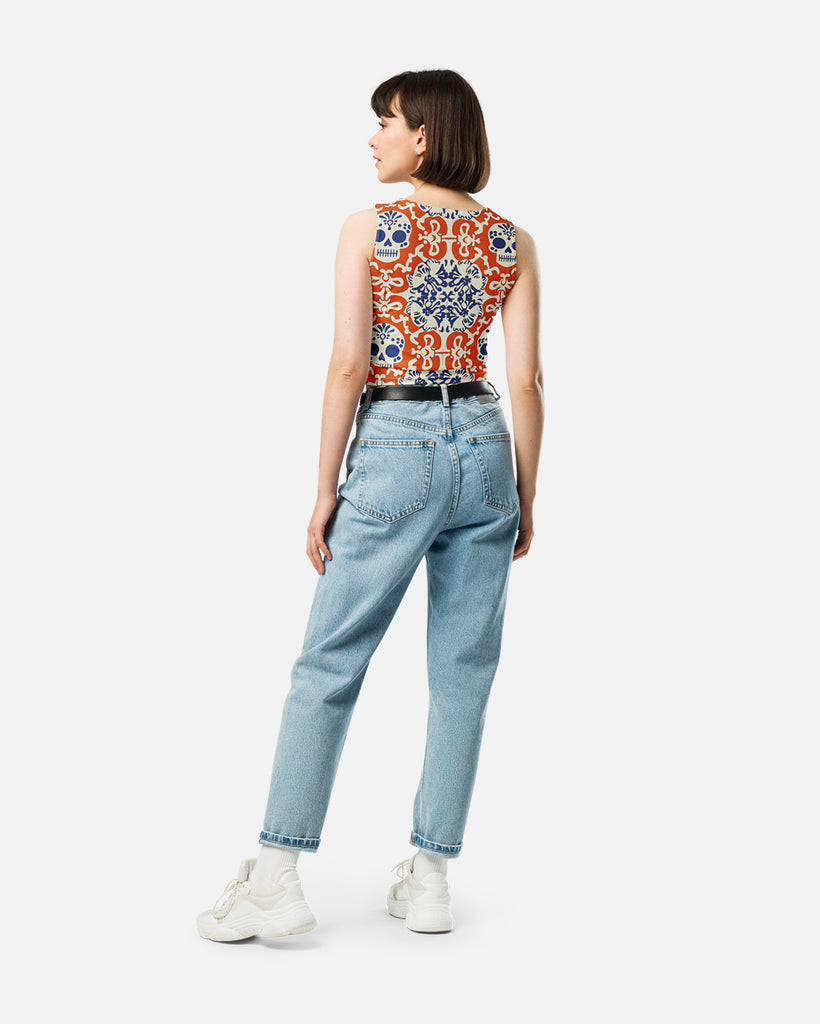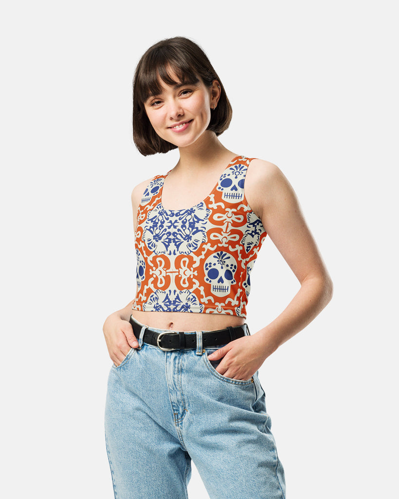 This figure-hugging crop top, featuring an all-over Calavera (skull) print, is inspired by the vibrant colors and spirit of Día de los Muertos. It's a celebration of life and a reminder that love never truly fades, living forever in the hearts of those who remember. Made from a comfy, stretchy microfiber yarn, this top is perfect for expressing your unique style.