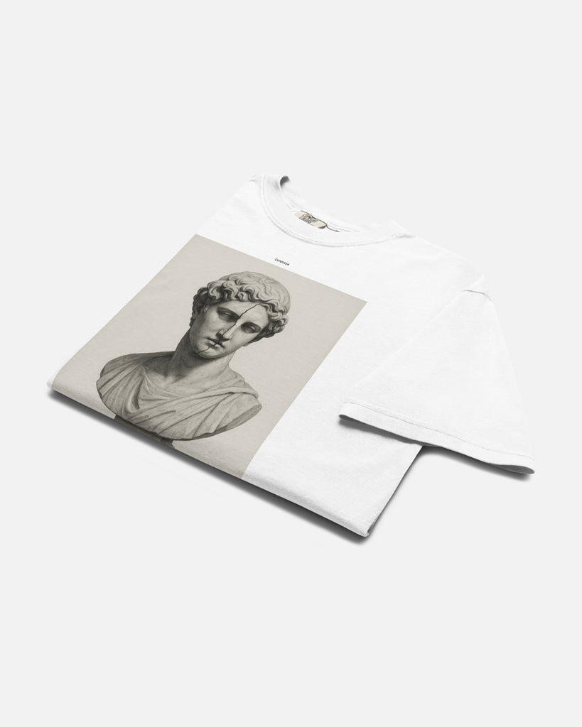 A study in contradiction. Masterpiece // Mistake features a classical bust fractured through the face — an icon of perfection, made human. Beneath it, a quiet truth: “There is no masterpiece without a mistake.”