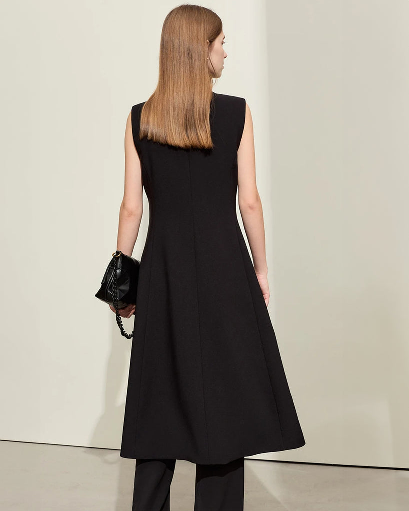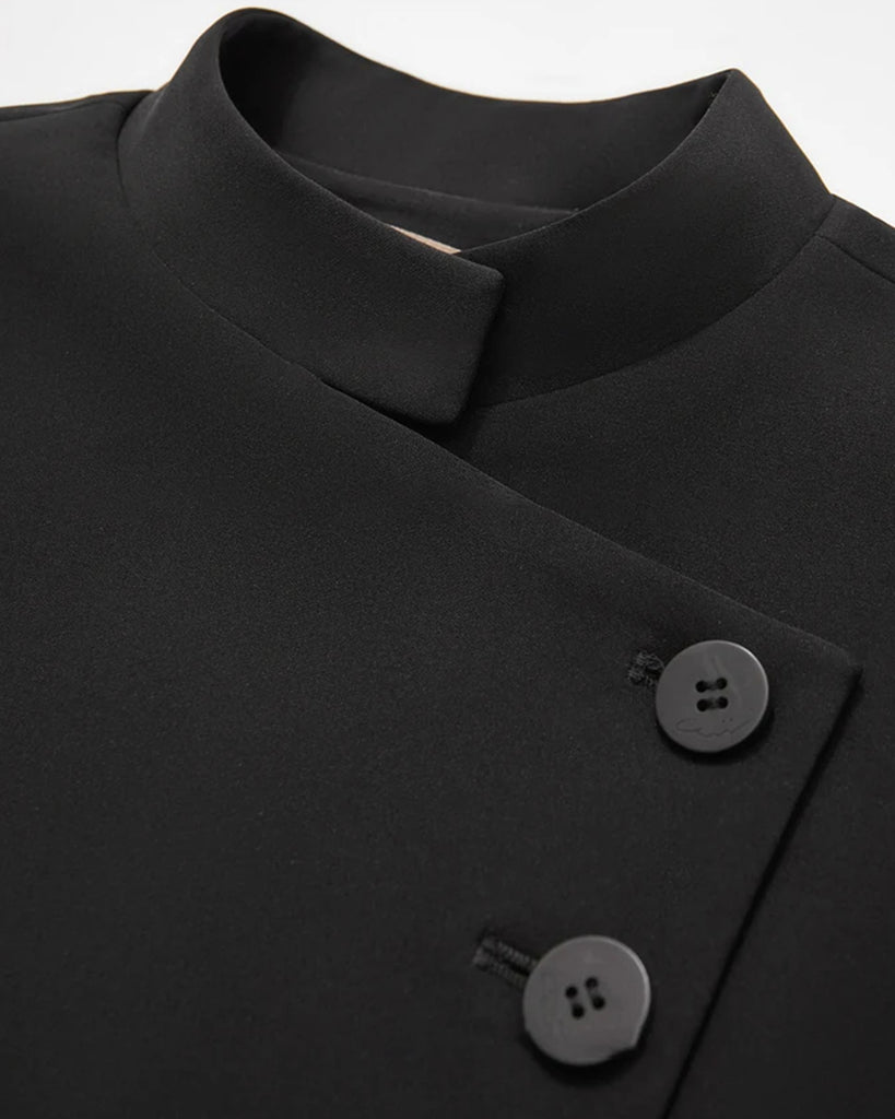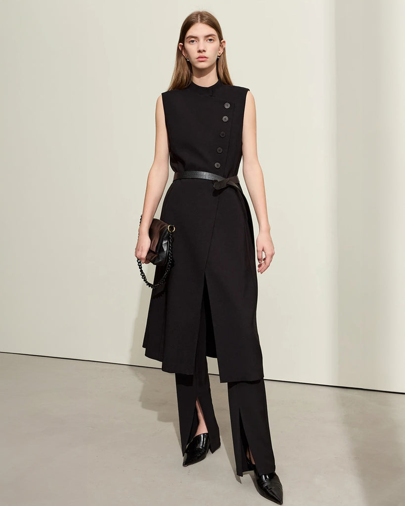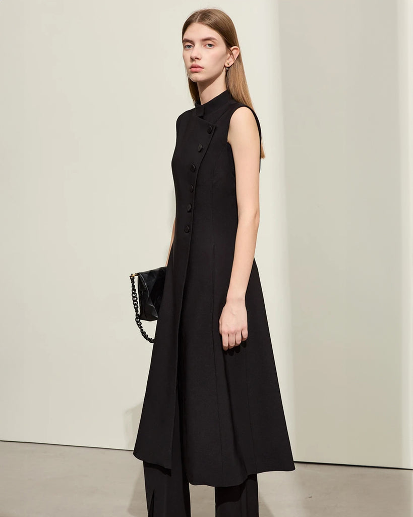 Eclipse, a minimalist elegant vest, perfect for the spring season. Featuring a new stand collar and oblique placket, this vintage-inspired piece is sleek yet timeless. Sleeveless for ultimate comfort and style.